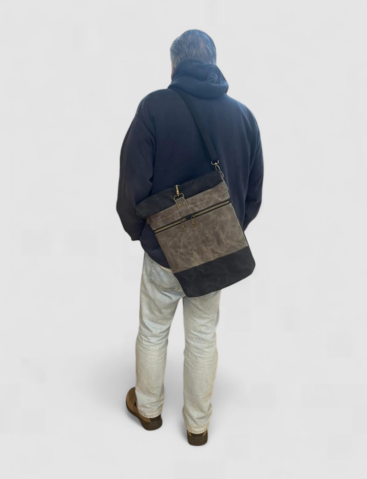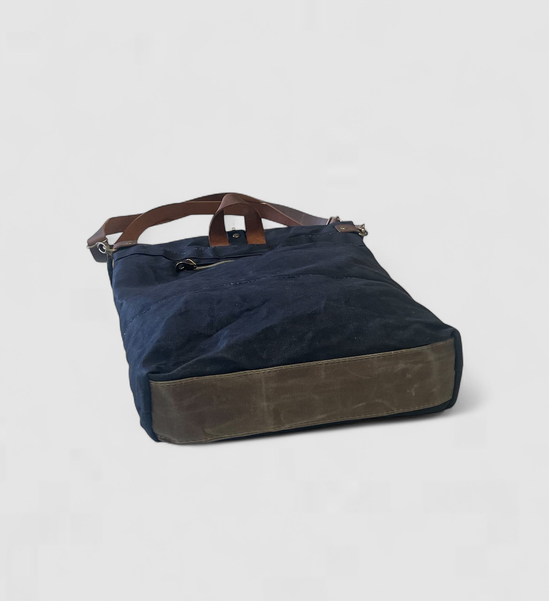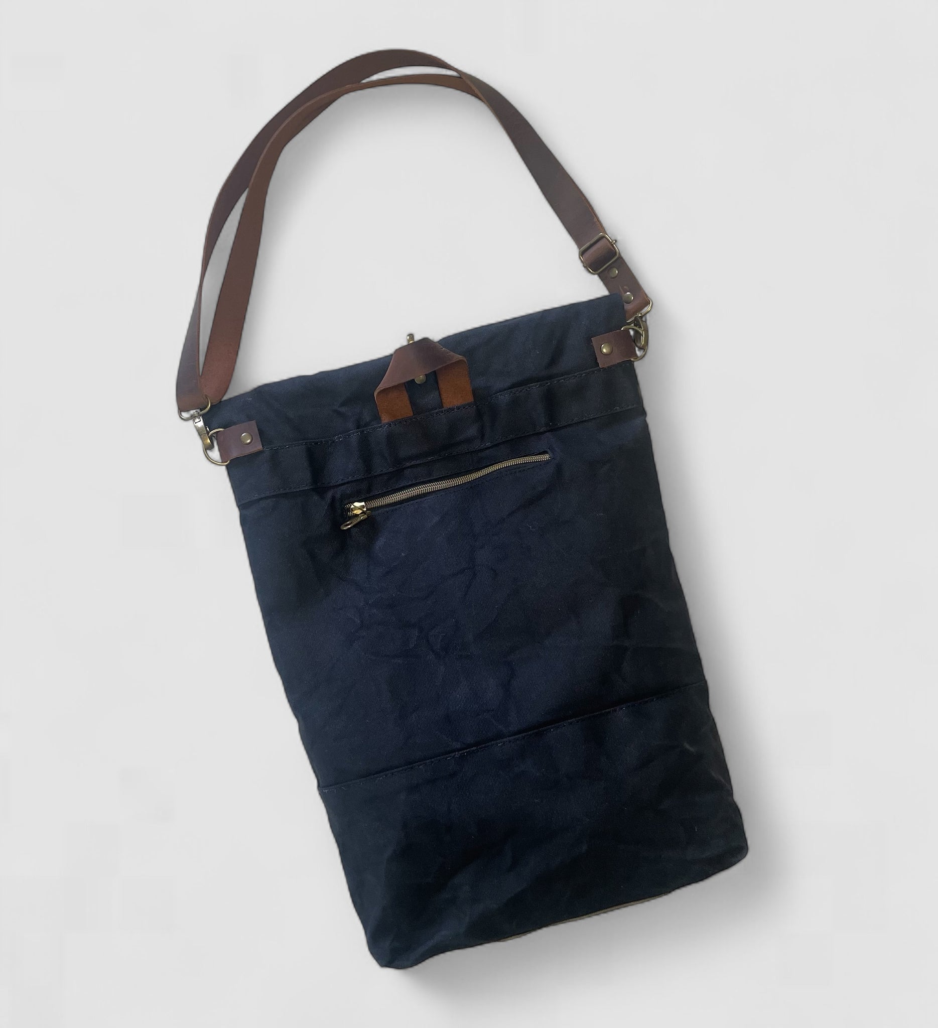 Leo is rugged, made of a very high end waxed canvas. He is 2 toned with the olive waxed on the front panel and black waxed, every where else. He was created by Lisa Maree's good friend, Leonard. Leonard merged the front look of our Lila, with our Harriet back pack body and voila! Leo has 2 front zippered pockets, one zippered back pocket, and 2 interior slip pockets. He comes with an elevated, adjustable leather crossbody strap which allows you to wear him on your shoulder or across your body. (would prefer a webbing strap instead of leather, please send us a message).